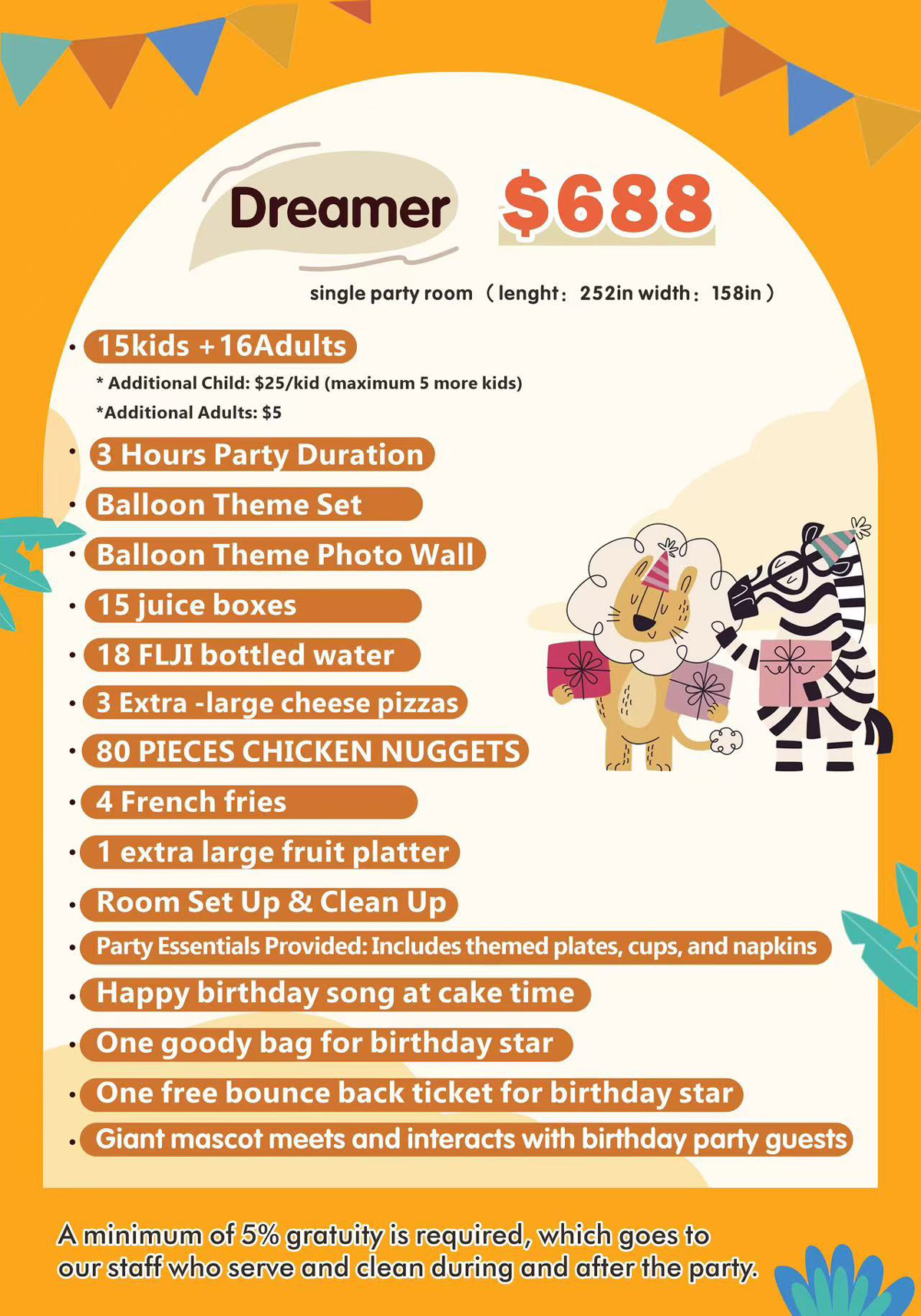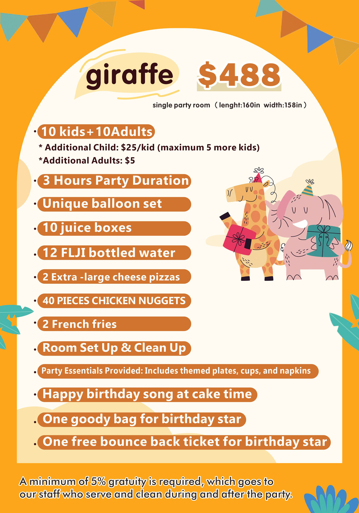 - A minimum of 5% gratuity is required, which goes to our staff who serve and clean during and after the party.